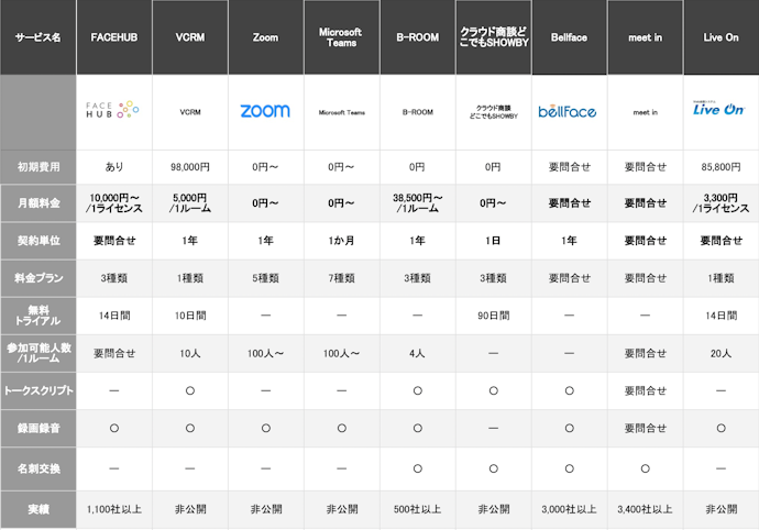 | 製品名 | VCRM | B-ROOM | クラウド商談どこでもSHOWBY | Bellface |