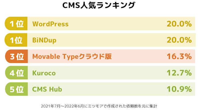 ミツモアの「ソフトウェア診断」において、最もリクエスト数が多かったCMSをランキングにしました。ランキング結果は2021年7月~2022年6月の期間を対象にしています。