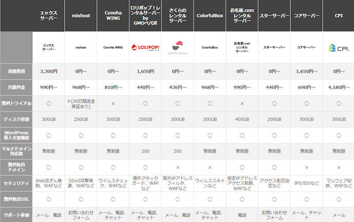 おすすめレンタルサーバーの10サービスの料金・機能・サポートを比較しました。月額料金は各サービスの代表的なプランで比較しています。