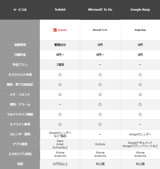 | Todoist | ![]() | 要問合せ | 0円~ | 3種類 | 〇 | ー | 〇 | 個人 | 10万社以上 |