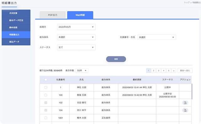 面倒な年末調整を自動計算します。1年の給与データがあれば、年末調整結果を簡単に給与計算に反映可能です。税金や保険料、控除額計にも対応しており、経理業務を大幅に効率化できるでしょう。計算過程はログ管理され、どこでどのような控除がおこなわれたのか、ひと目でわかります。また、年末調整の結果は給与明細などと同様にWeb公開ができます。