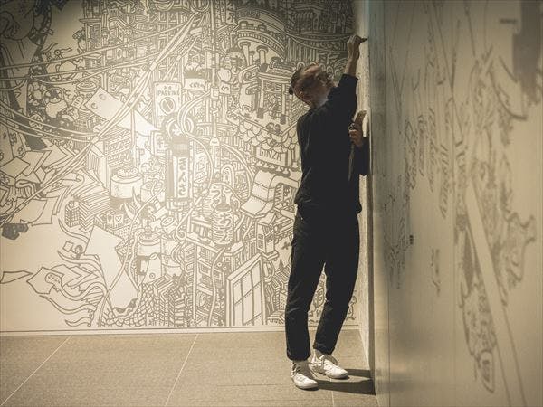 1階のメインエントランス横の通路では、大きな壁にその場で絵を描く高橋信雅さんのライブパフォーマンスが!お客さまのリクエストにも気軽に応じてくれました。