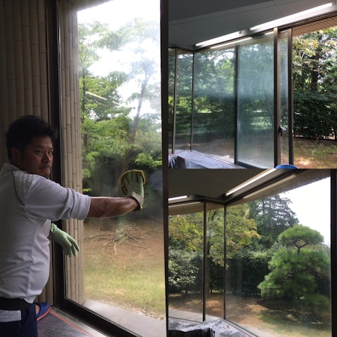 窓のシール跡を剥がして、綺麗にして頂きました。 薬品を使わないと消えない状態だったので、臭いや薬品の中での作業は大変だったと思います。 本当にシール跡が消え綺麗になりました。 ありがとうございます😭